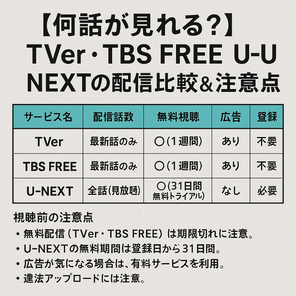 - TVer・TBS FREE・U-NEXTの配信話数と無料視聴範囲