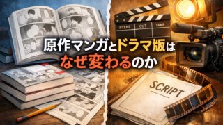 原作比較・読み解き 原作マンガとドラマ版はなぜ変わるのか──映像化で起きる“改変”の理由と読み解き方 「原作と違う…!」ドラマ化作品を観たとき、つい最初に出てしまう感想ですよね。でも、ひとまず落ち着いてください。ほとんどの場合、原作改変は、物語を壊すためのものではなく、“別の媒体で成立させるための調整”であり、物語の良さをより伝えやすくする... 2026.02.07 原作比較・読み解き